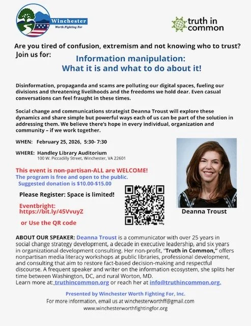 Truth in Common translates disinformation and social division research into skills people can use at home, at work and in the community. Through workshops, a newsletter, talks and partnerships, we create safe, brave spaces where people learn about today’s information ecosystem, how to access the information they need and how to feel comfortable talking about the issues again — respectfully.